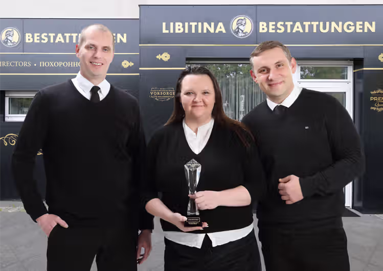 „Das Bestattungsunternehmen Libitina Bestattungen GmbH aus Berlin erhält für seine Hochleistungen in den Hauptkategorien Qualität, Leistung, Service und Effektivität den HIPE AWARD (High Performance Award) verliehen.“
